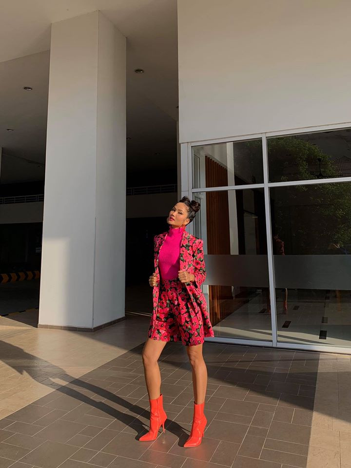 H'Hen Niê diện trang phục hoa sặc sỡ, cô phối cùng phụ kiện boost ngắn cổ cùng tông màu.