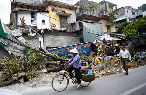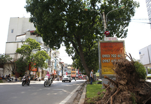 Hàng cây nghiêng và bị đổ trên đường Trần Nhân Tông đối diện khách sạn Niko