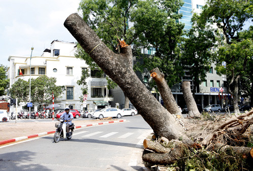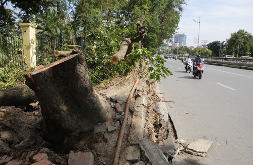 Tại ngã tư Quang Trung-Nguyễn Du vẫn còn những thân gỗ to vẫn chưa cắt bỏ hết khiến người đi đường bất an