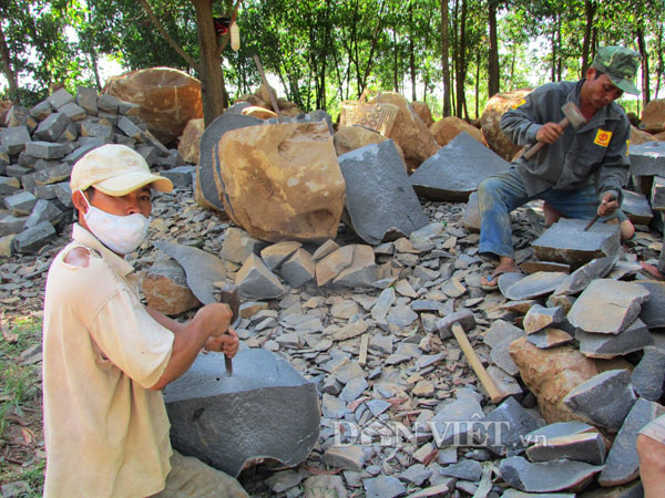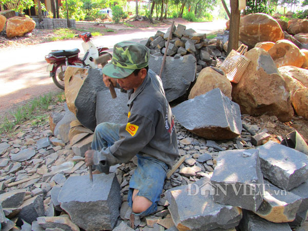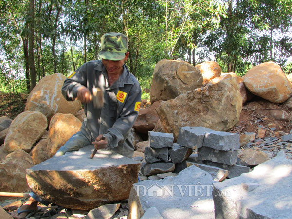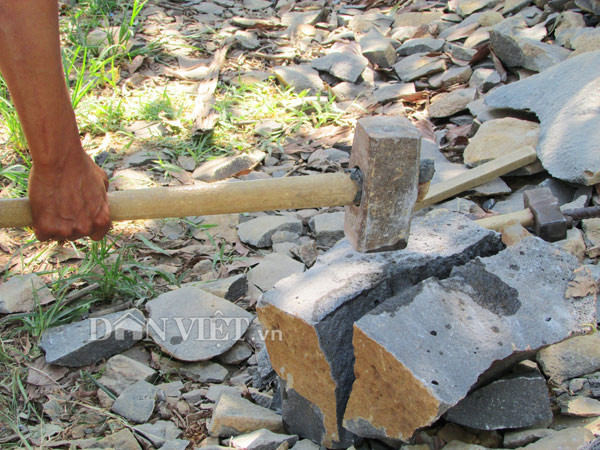 Để có được những viên đá thành phẩm phải trải qua nhiều công đoạn. Đầu tiên dùng búa, xà beng, đục để làm vỡ những khối đá tròn to thành từng khối nhỏ.