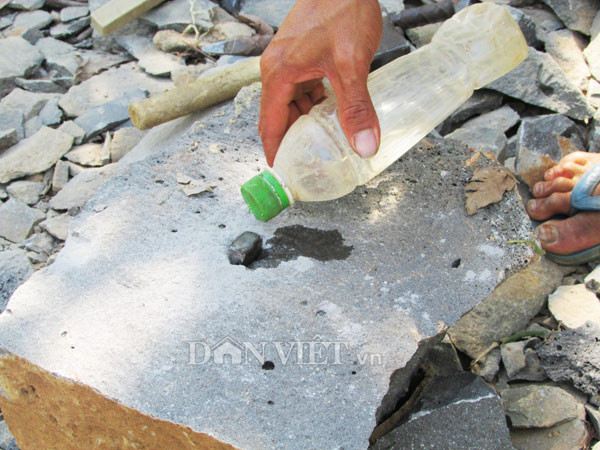 Dùng thước để đo kích cỡ viên đá. Sau đó dùng búa, đục đẽo một lỗ để đặt con chạm vào đó (tùy vào khối đá to hay nhỏ mà đặt nhiều hay ít con chạm).