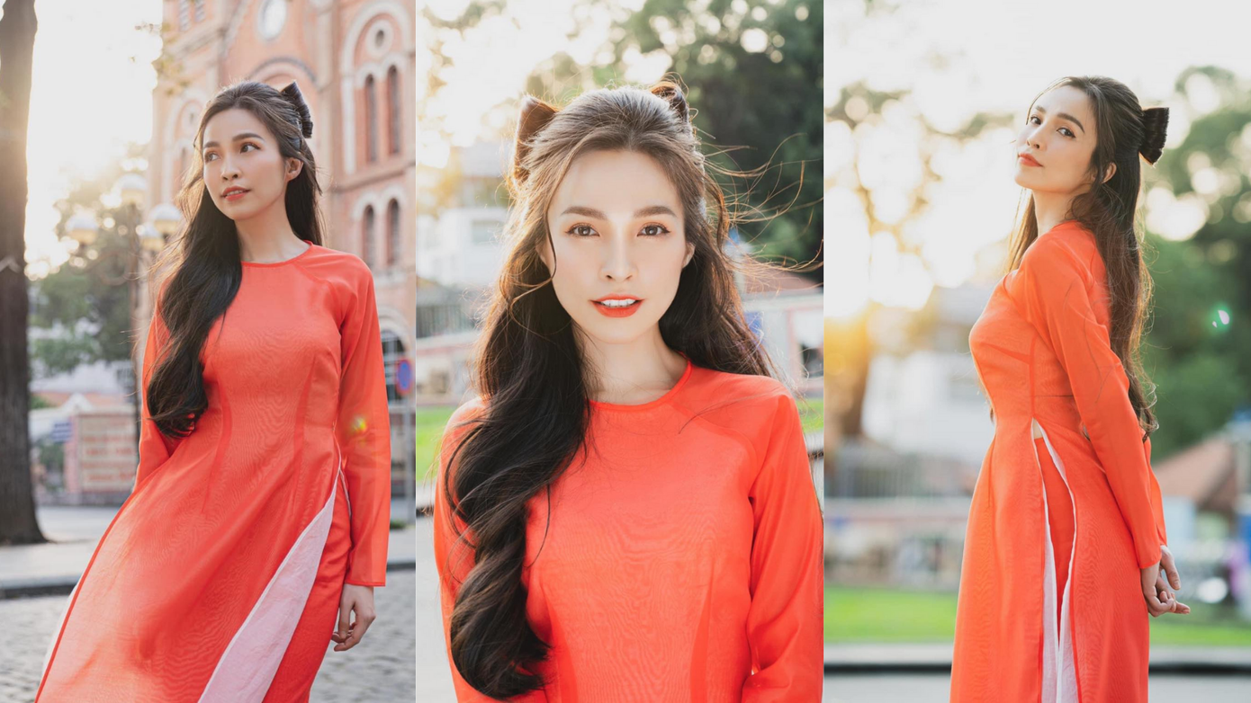 Hiền Thục rạng rỡ, trẻ trung khi xuống phố với tà áo dài đỏ thướt tha. Ở tuổi 39, nữ ca sĩ vẫn trẻ đẹp và giữ được vóc dáng quyến rũ như tuổi đôi mươi