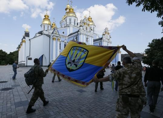 Trong khi đó, ở thủ đô Kiev ngày 19/8, các thành viên tiểu đoàn tự vệ Donbass mang theo cờ của họ tới một buổi lễ tổ chức ở Nhà thờ Mikhailovsky.