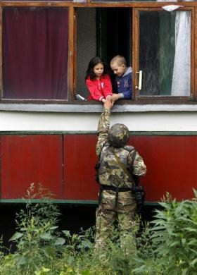 Hình ảnh bình dị giữa thời chiến. Một binh sĩ Ukraine trao kẹo cho hai em nhỏ ở thị trấn Popasna, tỉnh Donetsk ngày 18/8.