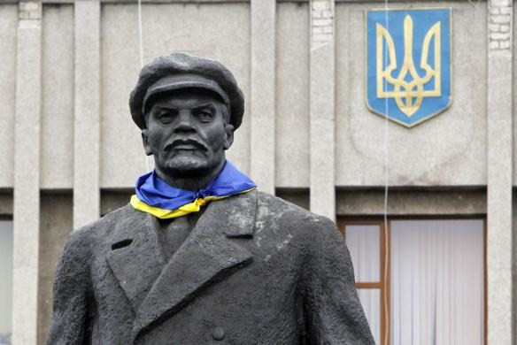 Lá cờ nước Nga được quàng qua cổ bức tượng cựu lãnh tụ Liên Xô Vladimir Lenin ở Slavyansk, tỉnh Donetsk.