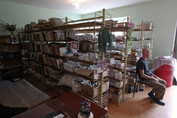 Thành viên tiểu đoàn dân quân tự vệ Donbass ngồi ở một thư viện trường, giờ được trưng dụng làm trạm y tế ở Popasna.