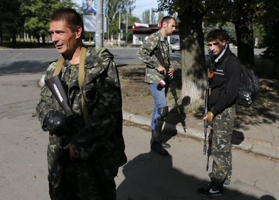 Những dân quân đứng gác trên một con phố ở Makiivka, ngoại ô Donetsk.