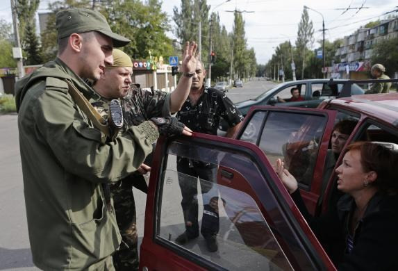Các tay súng ly khai thân Nga nói chuyện với người dân địa phương sống ở khu dân cư Makiivka.