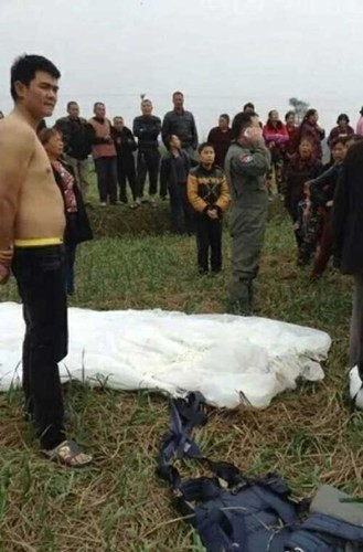 Rất may viên phi công đã phóng dù ra khỏi máy bay an toàn trước khi chiếc J-10B nổ tung. Lưu ý, theo các nhân chứng tại hiện trường cho rằng, có 2 phi công. Tuy nhiên, J-10B là loại một chỗ ngồi, báo chí Trung Quốc lý giải rằng, phi công J-10B được trang bị 2 dù. Trong ảnh là viên phi công chiếc J-10B đang gọi điện thoại.