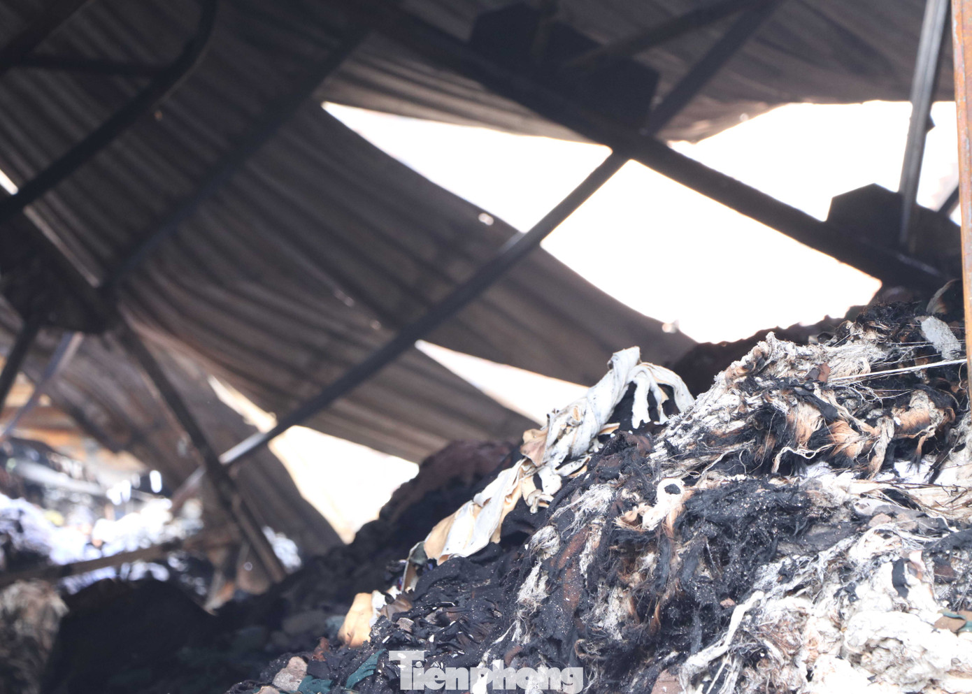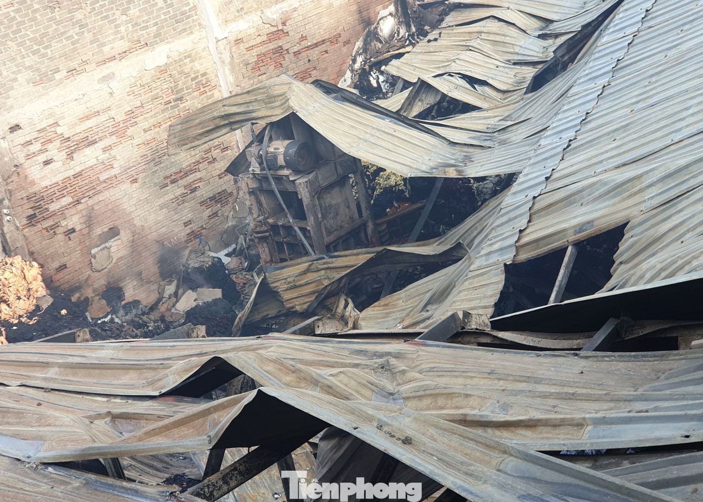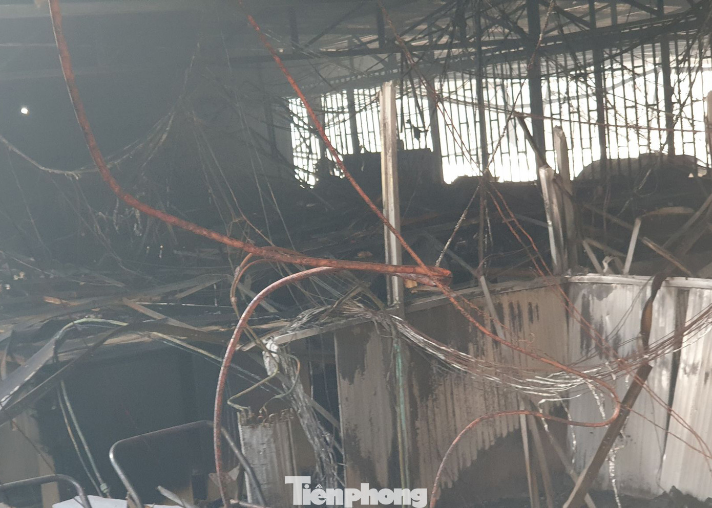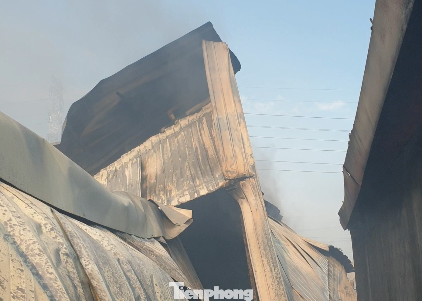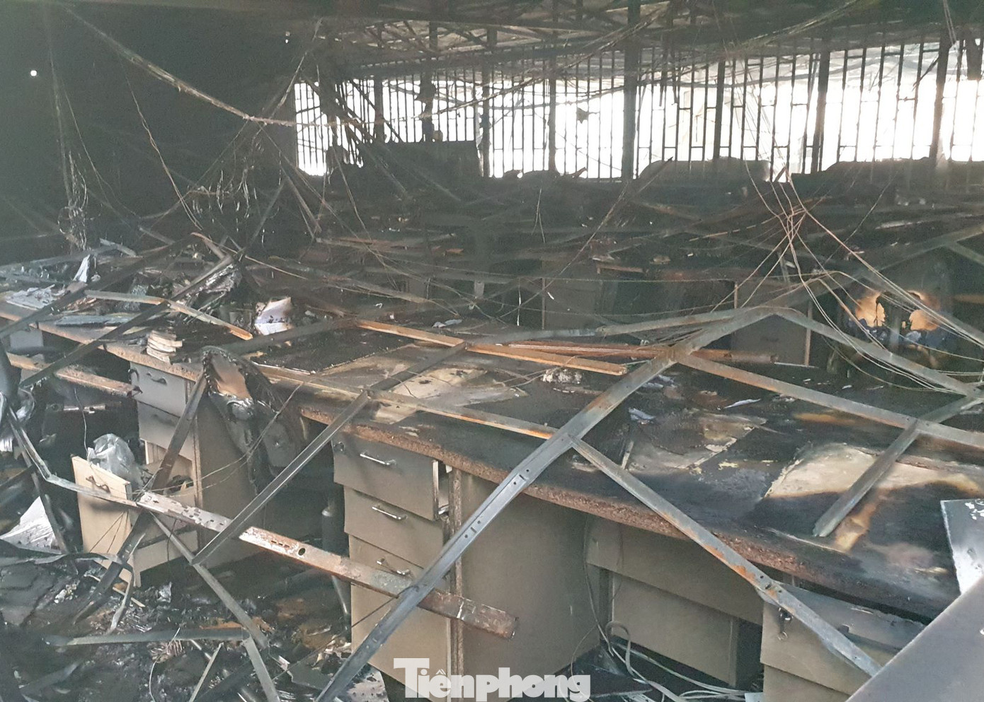 Tại hiện trường, khu nhà kho lợp tôn của hai công ty bị cháy rụi, đổ sập gần như hoàn toàn.