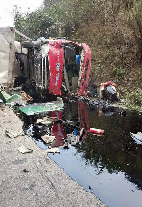 Tại hiện trường, xe khách và xe bồn nằm nghiêng bên vệ đường, bẹp dúm, kính chắn gió vỡ tan. Đồ đạc hành lý, vật dụng trong xe bắn tung toé ra ngoài. Xe bồn hư hỏng nặng phần đầu, bốc cháy, nhựa đường lỏng chảy dài vài chục mét trên đường. Ít nhất 3 người tử vong và 26 người khác bị thương sau vụ tai nạn. Chiếc xe bồn quay ngang đường, khiến quốc lộ 6 bị ách tắc theo cả hai chiều.