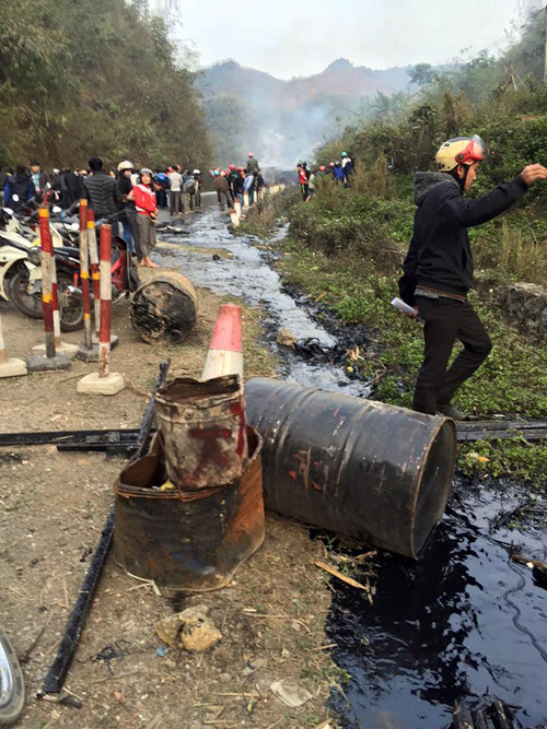 Nhựa đường chảy lênh láng, kéo dài cả trăm mét trên đường.