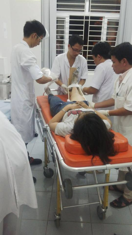 Nữ hành khách bị gãy chân đang được cấp cứu tại bệnh viện. Ảnh: Lào Cai Online
