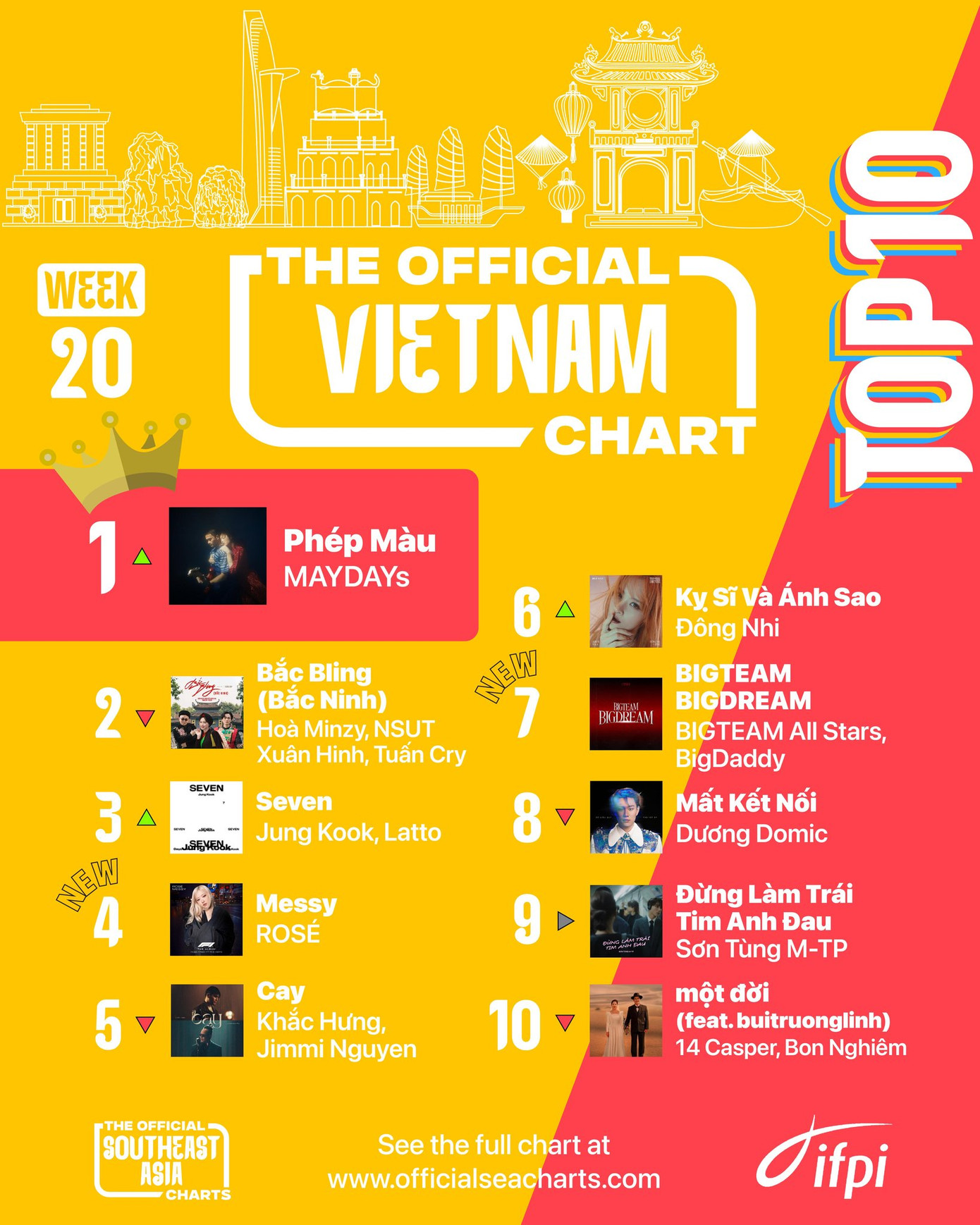 Theo thông tin từ bảng xếp hạng IFPI tại Việt Nam, ca khúc Phép màu (MAYDAYs, Minh Tốc) là ca khúc dẫn đầu tuần 20, chính thức soán ngôi đầu bảng của loạt 'hit' Việt Nam lẫn quốc tế như Bắc bling (Hòa Minzy, NSƯT Xuân Hinh, Tuấn Cry), Seven (Jung Kook, Latto)...