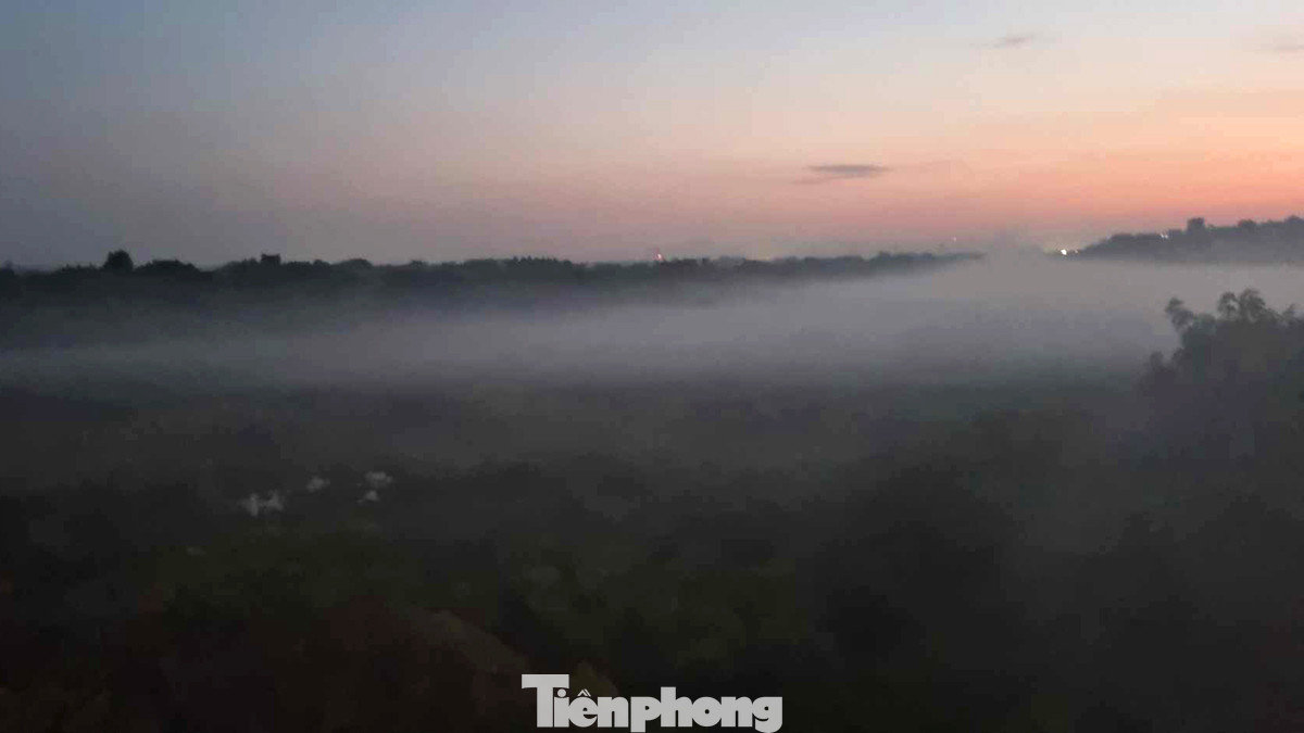 Khu vực bãi giữa của sông Hồng thường được biết đến với những thảm thực vật xanh mướt, nay thêm làn sương bảng lảng càng làm nổi bật những tòa nhà cao tầng phía xa của Hà Nội.