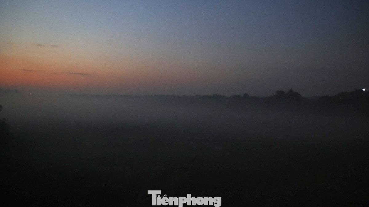 Vào thời điểm mặt trời dần khuất dần sau dãy núi Ba Vì phía xa, những làn sương khói mờ ảo xuất hiện nhiều phía dưới bãi giữa của khu vực chân cầu Long Biên.