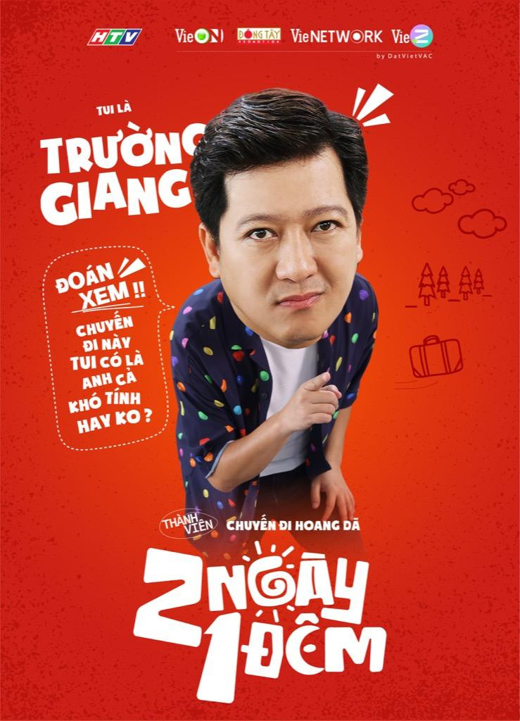 Từng quen thuộc với khán giả trong chương trình Running Man Vietnam, Trường Giang sẽ là "anh cả" tại 2 Ngày 1 Đêm. Là một người sành nấu ăn, hiểu biết về địa lý vùng miền lẫn vô số mẹo vặt hữu ích trong đời sống, Trường Giang được đặt niềm tin là " phiên bản Google" của các anh em.
