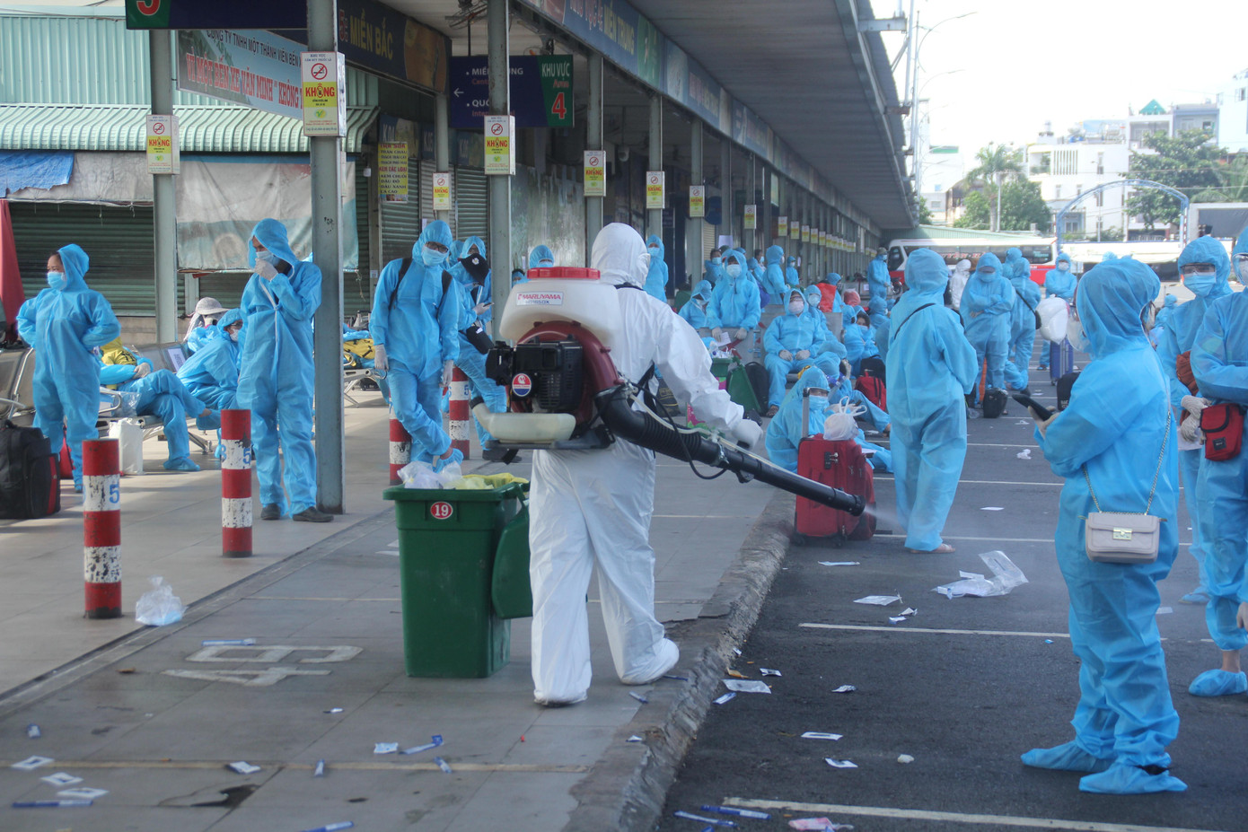 | Trước khi lên xe, người dân và hành lý đi kèm được xịt khử khuẩn cẩn thận. |