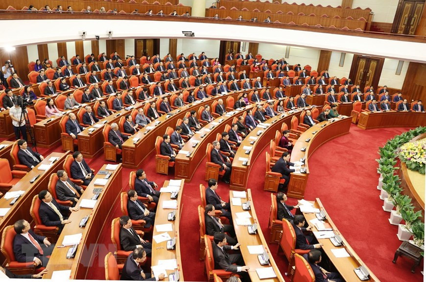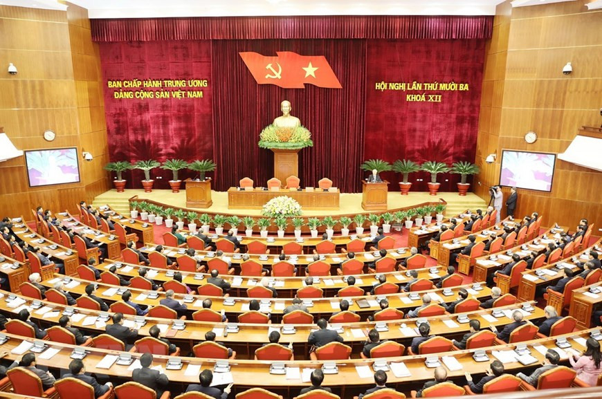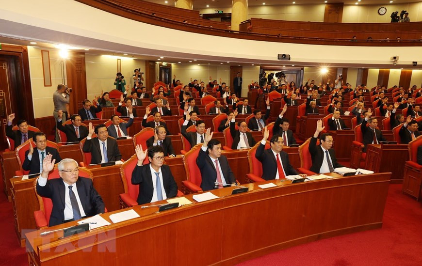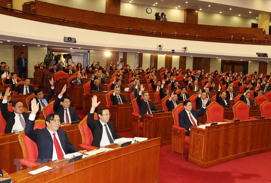 Các đồng chí lãnh đạo Đảng, Nhà nước và các đại biểu biểu quyết thông qua Nghị quyết Hội nghị Trung ương lần thứ 13. (Ảnh: Trí Dũng/TTXVN).