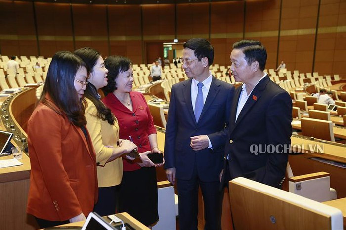 Các đại biểu Quốc hội trao đổi bên lề phiên họp chiều 08/11.