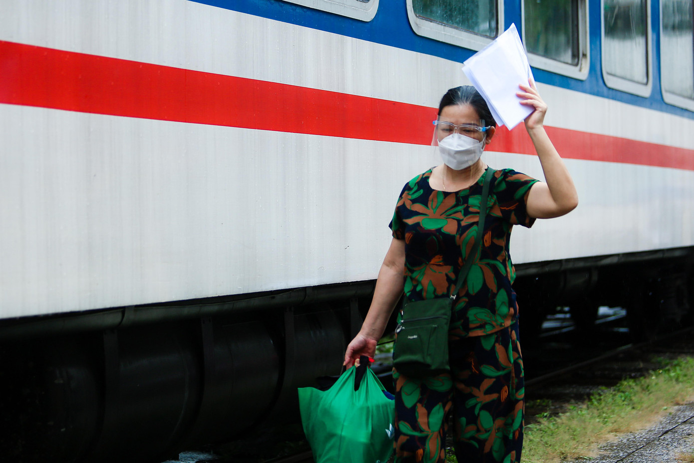 | Hành khách phấn khởi khi có mặt trên chuyến tàu về nhà sau nhiều tháng mắc kẹt tại Hà Nội vì dịch bệnh COVID-19. |
