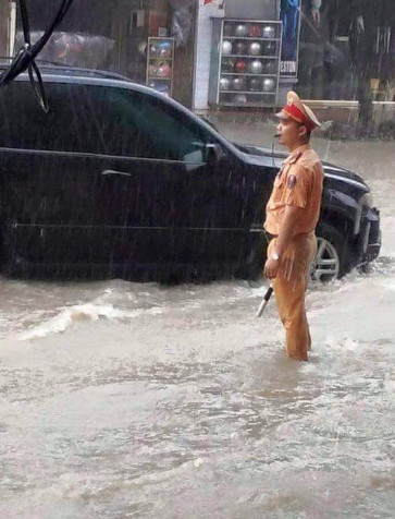 Tuy nhiên, các chiến sĩ vừa phân luồng, vừa đẩy xe hộ dân. Bất chấp mưa như trút, người không kịp mặc áo mưa, các chiến sĩ vẫn nhặt rác, các đoạn cây cối tràn ra đường để nước mau thoát gây xúc động mạnh với rất nhiều người dân đang ngồi trên xe bị ách tắc.
