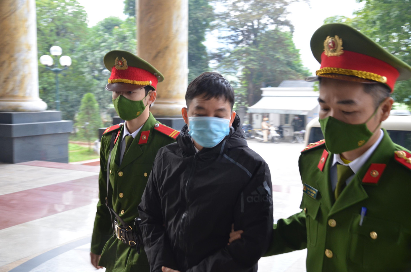 Từ 7h20, cảnh sát sử dụng ô tô loại 29 chỗ dẫn giải nhóm bị cáo bị giam giữ đến phòng xử số 03 trụ sở TAND cấp cao.