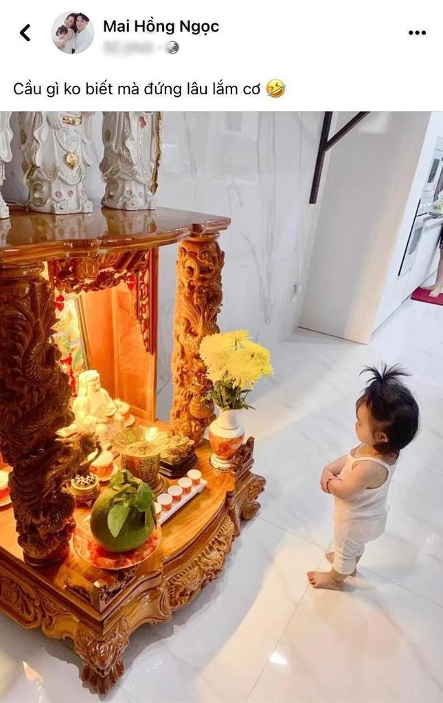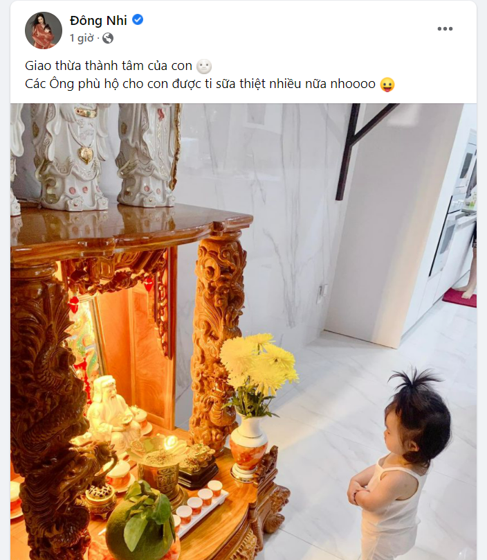 Giao thừa luôn là thời gian để mọi người đoàn viên, sum vầy và cùng thực hiện những nghi thức cúng bái truyền thống. Gia đình nhỏ của Đông Nhi - Ông Cao Thắng cũng không ngoại lệ. Trên fanpage của mình, Đông Nhi đã đăng tải hình ảnh cô con gái nhỏ Winnie đứng ngoan ngoãn khoanh tay trước bàn thờ Thần tài. Nữ ca sĩ hài hước chia sẻ: "Giao thừa thành tâm của con. Các Ông phù hộ cho con được ti sữa thật nhiều nữa nha".