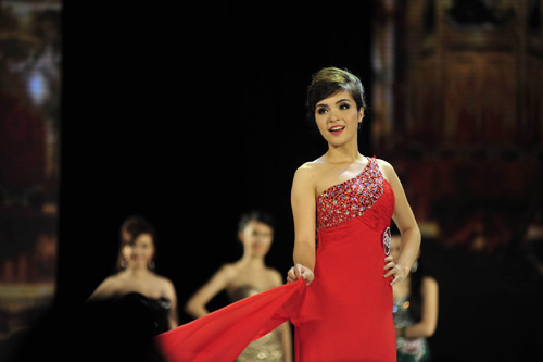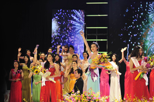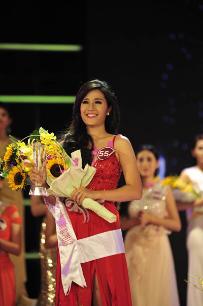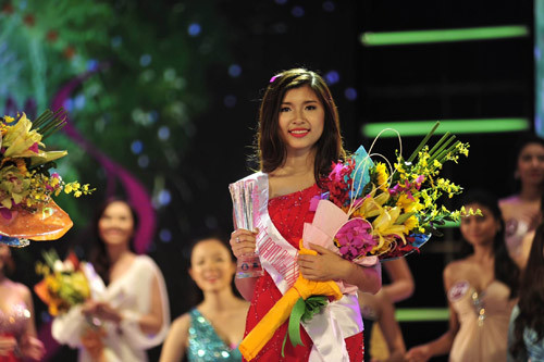 Thí sinh Trần Diễm Ái Vi (đứng giữa), SBD 102, Sinh viên Trường Đại học Kinh tế - Luật (Đại học Quốc gia TP HCM) đoạt Vương miện tại đêm Chung kết cuộc thi ‘Nữ sinh Việt Nam duyên dáng 2013’.
