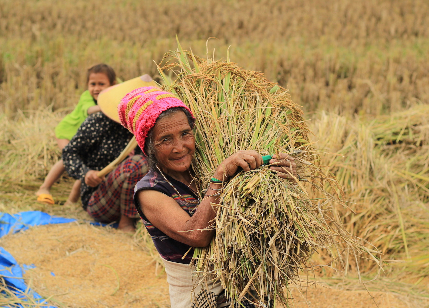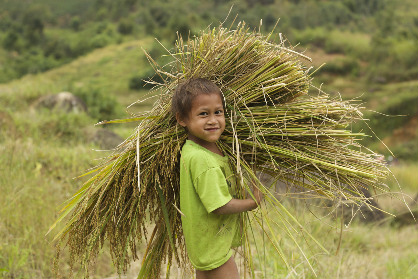 Các em nhỏ cũng thi nhau vác lúa giúp người lớn
