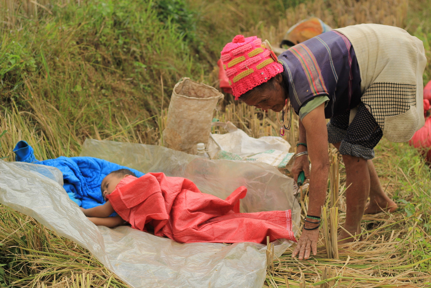 Em bé ngủ trên ruộng lúa bậc thang