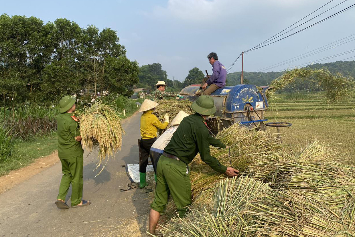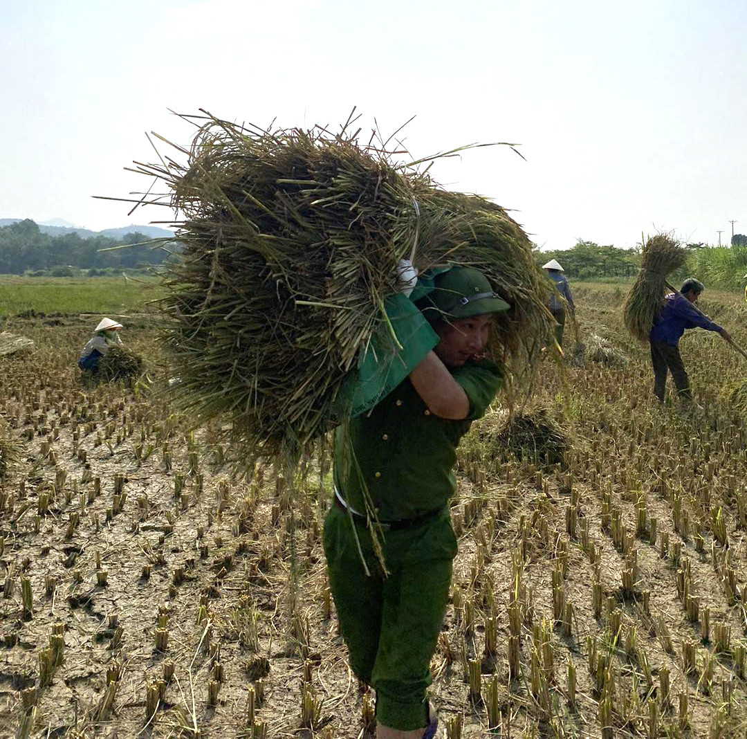 Trong những ngày qua, từ sáng sớm, trên cánh đồng lúa chín vàng ở xã Cẩm Long, huyện Cẩm Thuỷ, các chiến sỹ đã cùng người dân xuống đồng thu hoạch lúa chín.