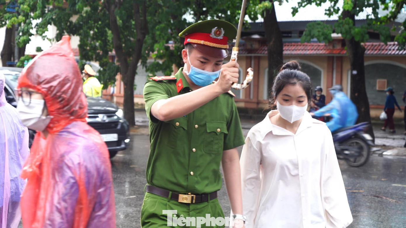 | Thời tiết có mưa, các cán bộ, chiến sỹ CSGT còn tham gia hỗ trợ thí sinh vào phòng thi để không bị ướt. |