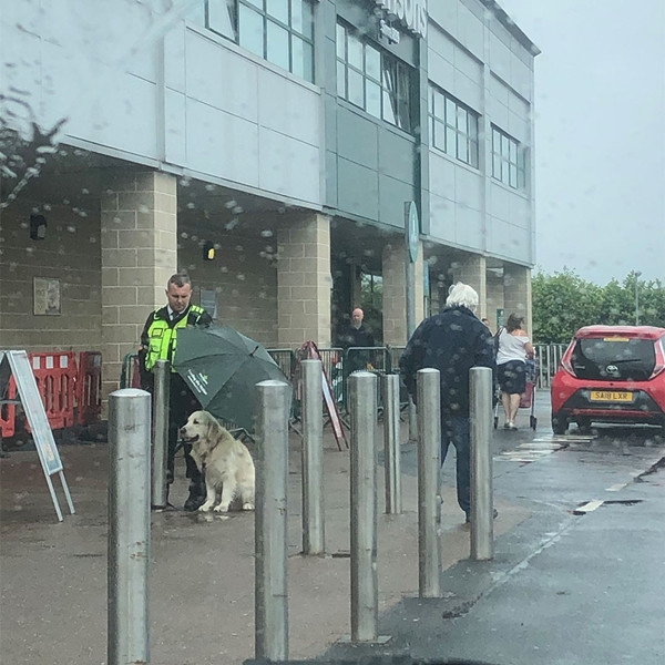 Đây là bức ảnh được chụp trước cửa siêu thị Morrisons tại Giffnock (Scotland). Người chụp ảnh kể lại rằng, anh bảo vệ đó nói: “Làm sao chúng ta biết được loài chó cảm thấy thế nào khi bị mưa chứ”.