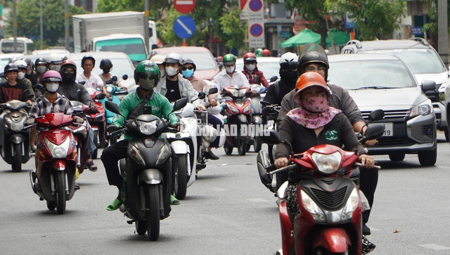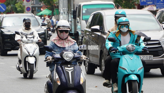 Người dân mặc áo khoác, đeo khẩu trang, bao tay, kính mát khi di chuyển dưới thời tiết nắng nóng