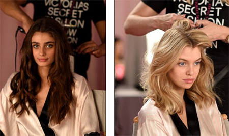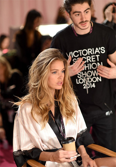 Hai "thiên thần" của nhãn hiệu Victoria's Secret - Behati Prinsloo và Doutzen Kroes vui đùa bên nhau trong giờ trang điểm chuẩn bị cho Victoria's Secret Fashion Show 2014 .