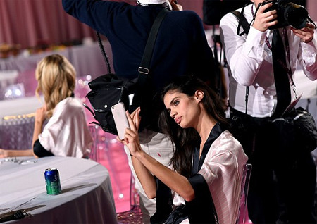 Các siêu mẫu tranh thủ "tự sướng" trong phòng trang điểm.
