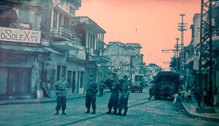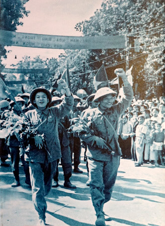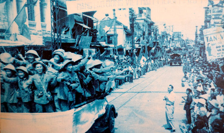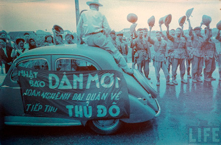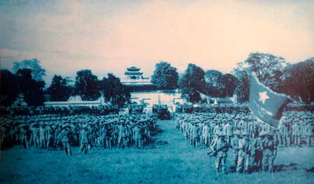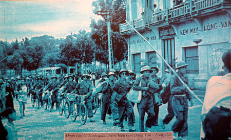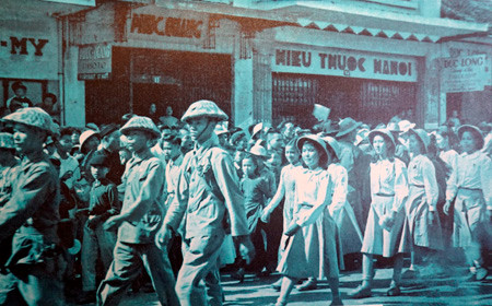 Đoàn cán bộ hành quân về Hà Nội trước hiệu kem Long Vân - Hồng Vân (nay là Quảng trường Đông Kinh Nghĩa Thục).