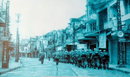 Quân tiếp quản đang tiến qua bờ hồ Hoàn Kiếm, phố Đinh Tiên Hoàng.