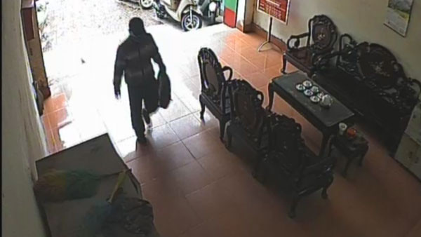Đối tượng mang theo túi xách, đeo khẩu trang, đội mũ lưỡi trai xuất hiện ở phòng giao dịch chiều 26/1.