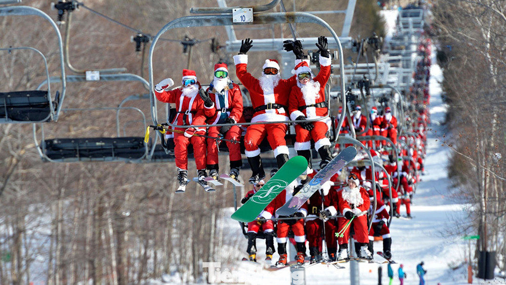 Những người tham gia sự kiện trượt tuyết thường niên Santa Sunday mặc trang phục ông già Noel đang ngồi cáp treo lên đỉnh núi để trượt tuyết ở Newry, Maine, Hoa Kỳ. Đây là một sự kiện nhằm quyên góp cho quỹ từ thiện The River Fund, một tổ chức phi lợi nhuận hỗ trợ giáo dục cho trẻ em.