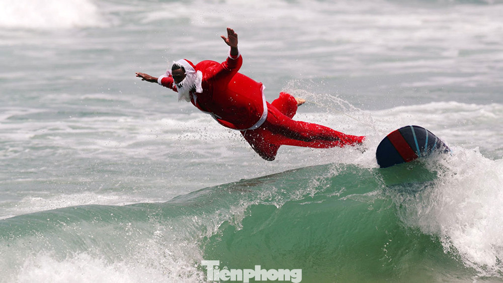 Carlos Bahia, một vận động viên lướt sóng ở Brasil mặc trang phục ông già Noel đang trình diễn tài năng của mình ở bãi biển Maresias, Sao Sebastiao.