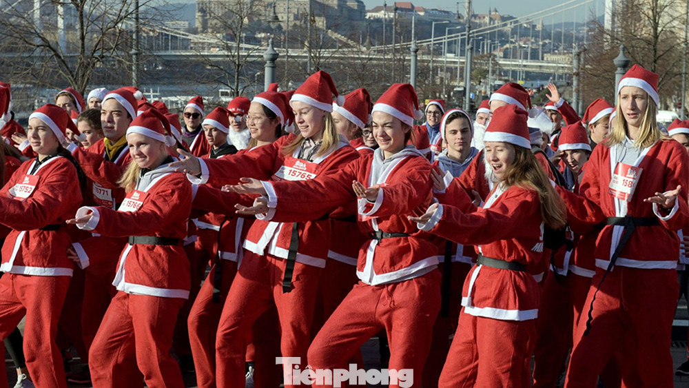 Những sinh viên mặc trang phục ông già Noel đang khởi động để tham gia cuộc thi chạy thường niên Santa Run tại thủ đô Budapest, Hungary.