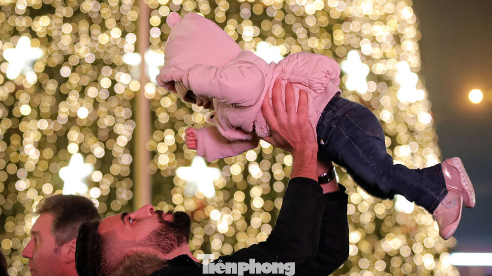 Một người đàn ông đang bế đứa con gái của mình tại hội chợ Giáng Sinh ở thành phố Bucharest, Romania.