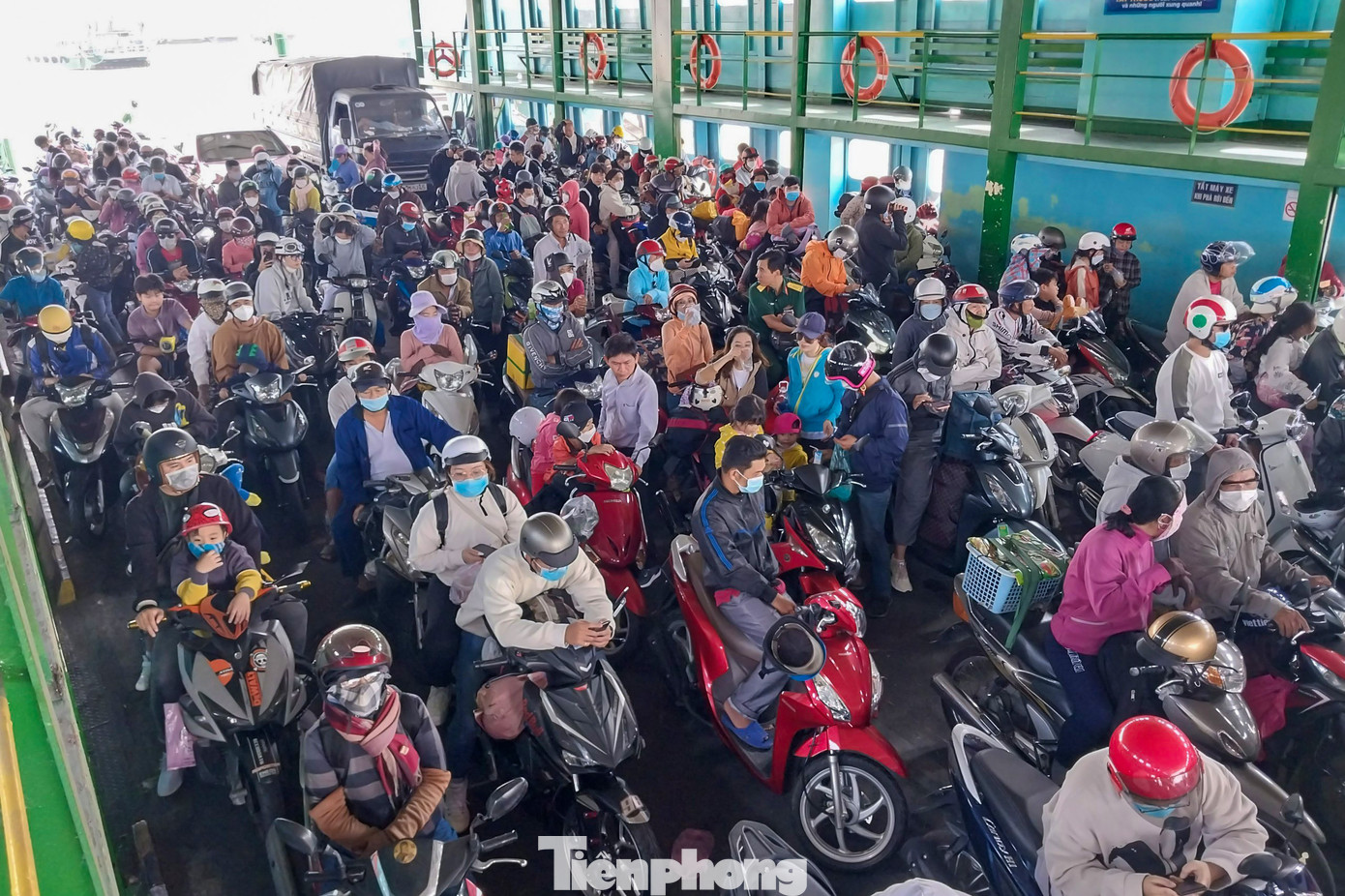 | Khác với sự thưa thớt phía huyện Nhơn Trạch (tỉnh Đồng Nai), bến phà Cát Lái phía TP Thủ Đức (TPHCM) có hàng nghìn phương tiện chở hành lý lỉnh kỉnh nối đuôi nhau chờ qua phà. |