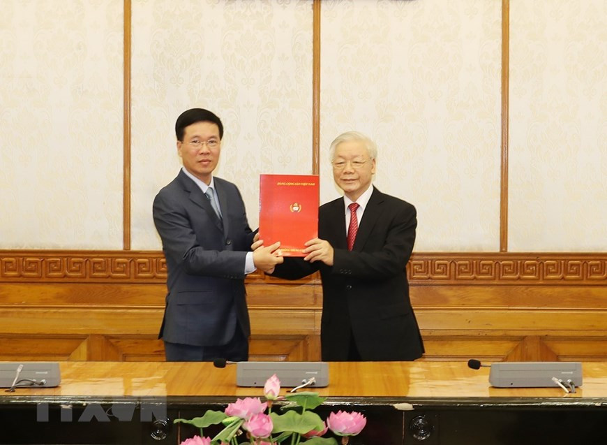 Tổng Bí thư, Chủ tịch nước Nguyễn Phú Trọng tặng hoa chúc mừng ông Võ Văn Thưởng, Ủy viên Bộ Chính trị, giữ chức Thường trực Ban Bí thư. (Ảnh: Trí Dũng/TTXVN)