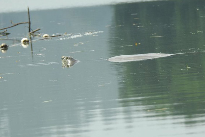 Một bức ảnh khác được chụp vào tháng 4/2018, ngay sau khi công bố phát hiện thêm một cá thể rùa Hoàn Kiếm ở hồ Xuân Khanh. Mới đây các nhà khoa học đã làm một thảm tre nổi trên mặt hồ Đồng Mô với hy vọng “dụ” rùa Hoàn Kiếm lên sưởi nắng để từ đó quan sát thêm cá thể rùa này.