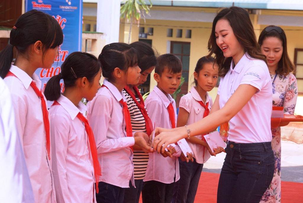 Người đẹp Kim Trà My (TOP 20 Miss World Việt Nam 2019) tham gia trao học bổng cho học sinh nghèo tại xã Châu Sơn.