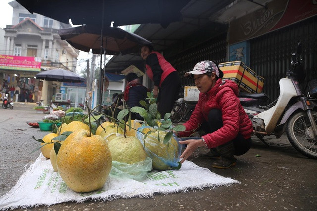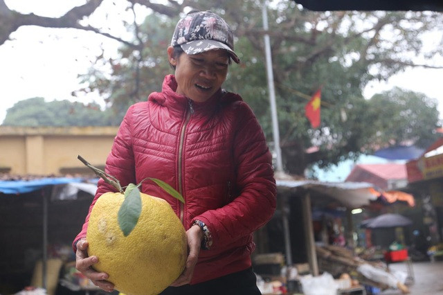 Người phụ nữ tranh thủ trên đường đi chợ về mua trái bòng để trưng vào mâm ngũ quả thờ tại nhà.