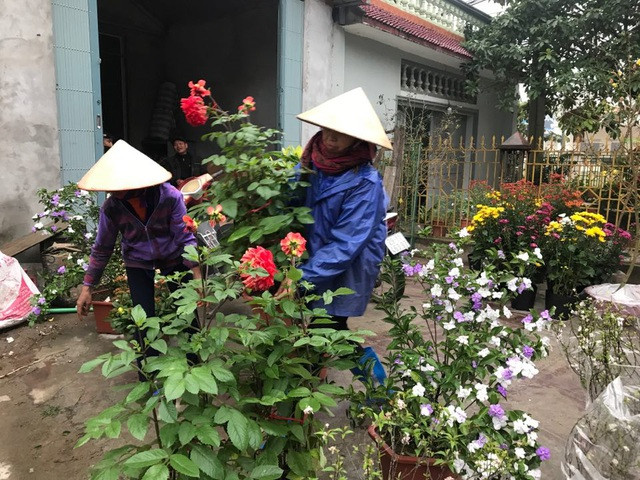 Những chậu hoa rực rỡ sắc màu được bày biện dọc đường làng phục vụ nhu cầu trang trí ngày Tết của người dân địa phương.